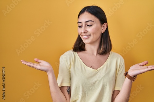 Hispanic girl wearing casual t shirt over yellow background smiling showing both hands open palms, presenting and advertising comparison and balance