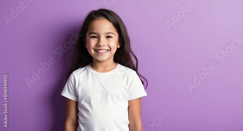 hispanic latino kid girl purple background wearing plain white tshirt smiling happy portrait