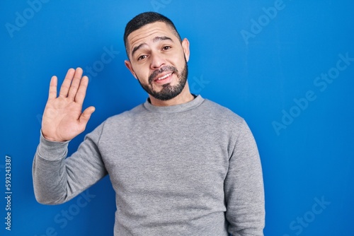 Hispanic man standing over blue background waiving saying hello happy and smiling, friendly welcome gesture