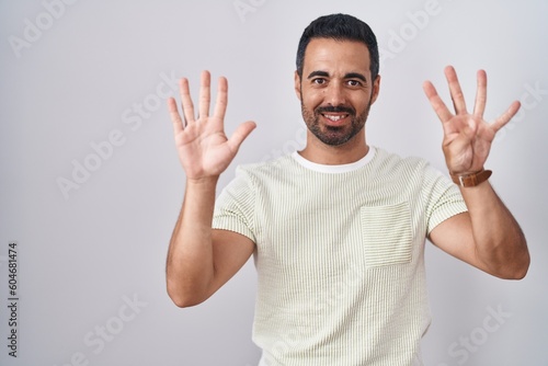 Hispanic man with beard standing over isolated background showing and pointing up with fingers number nine while smiling confident and happy.