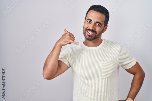 Hispanic man with beard standing over isolated background smiling doing phone gesture with hand and fingers like talking on the telephone. communicating concepts.