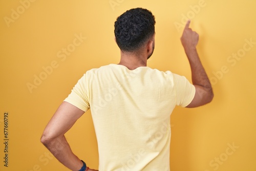 Hispanic man with beard standing over yellow background posing backwards pointing ahead with finger hand