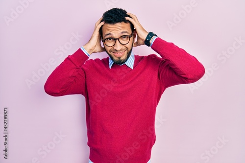 Hispanic man with beard wearing business shirt and glasses suffering from headache desperate and stressed because pain and migraine. hands on head.