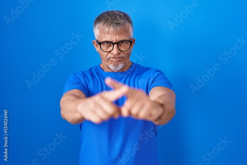 Hispanic man with grey hair standing over blue background rejection expression crossing fingers doing negative sign