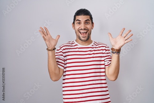 Hispanic man with long hair standing over isolated background celebrating crazy and amazed for success with arms raised and open eyes screaming excited. winner concept