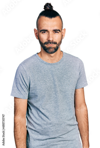 Hispanic man with ponytail wearing casual grey t shirt skeptic and nervous, frowning upset because of problem. negative person.