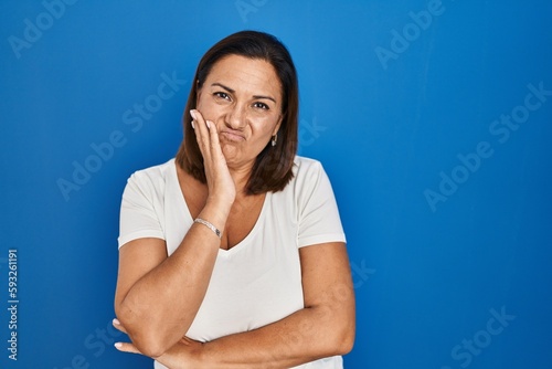 Hispanic mature woman standing over blue background thinking looking tired and bored with depression problems with crossed arms.