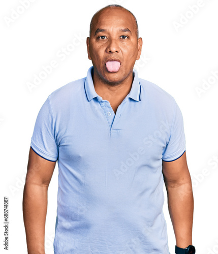 Hispanic middle age man wearing casual t shirt sticking tongue out happy with funny expression. emotion concept.