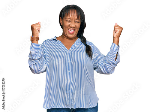 Hispanic middle age woman wearing casual clothes screaming proud, celebrating victory and success very excited with raised arms