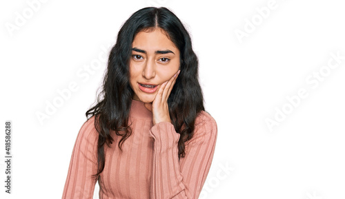 Hispanic teenager girl with dental braces wearing casual clothes touching mouth with hand with painful expression because of toothache or dental illness on teeth. dentist