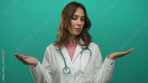 Hispanic woman doctor with stethoscope gestures over isolated green background pondering options.