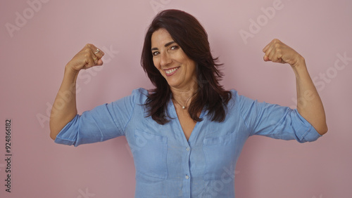 Hispanic woman flexing muscles and smiling confidently in a blue shirt, isolated over a pink wall background.