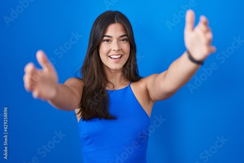 Hispanic woman standing over blue background looking at the camera smiling with open arms for hug. cheerful expression embracing happiness.