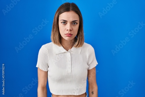 Hispanic woman standing over blue background relaxed with serious expression on face. simple and natural looking at the camera.