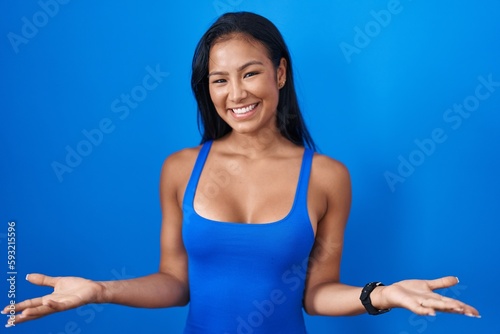 Hispanic woman standing over blue background smiling cheerful with open arms as friendly welcome, positive and confident greetings