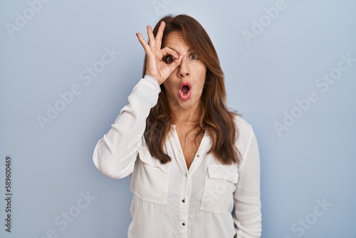 Hispanic woman standing over isolated background doing ok gesture shocked with surprised face, eye looking through fingers. unbelieving expression.