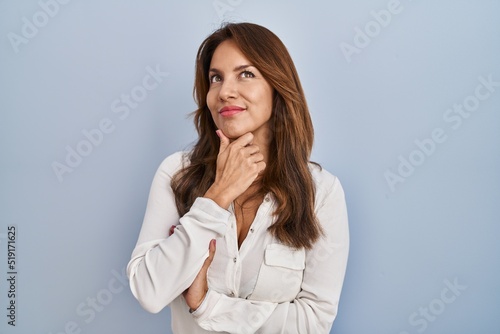 Hispanic woman standing over isolated background looking confident at the camera smiling with crossed arms and hand raised on chin. thinking positive.