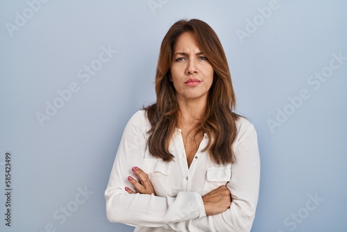 Hispanic woman standing over isolated background skeptic and nervous, disapproving expression on face with crossed arms. negative person.