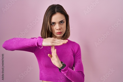 Hispanic woman standing over pink background doing time out gesture with hands, frustrated and serious face