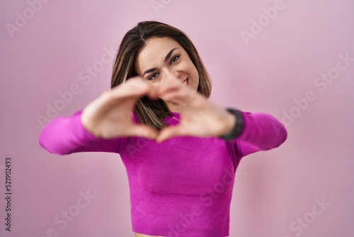 Hispanic woman standing over pink background smiling in love doing heart symbol shape with hands. romantic concept.