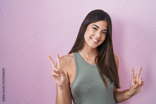 Hispanic woman standing over pink background smiling looking to the camera showing fingers doing victory sign. number two.