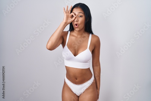 Hispanic woman wearing lingerie doing ok gesture shocked with surprised face, eye looking through fingers. unbelieving expression.