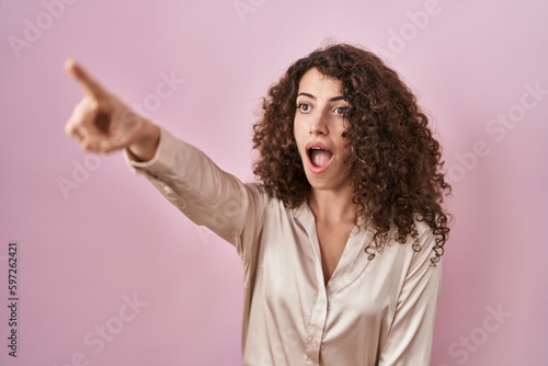 Hispanic woman with curly hair standing over pink background pointing with finger surprised ahead, open mouth amazed expression, something on the front