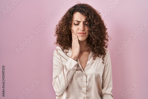 Hispanic woman with curly hair standing over pink background touching mouth with hand with painful expression because of toothache or dental illness on teeth. dentist