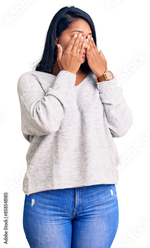 Hispanic woman with long hair wearing casual clothes rubbing eyes for fatigue and headache, sleepy and tired expression. vision problem