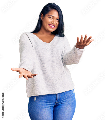 Hispanic woman with long hair wearing casual clothes smiling cheerful with open arms as friendly welcome, positive and confident greetings