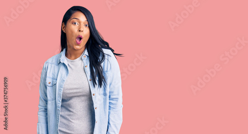 Hispanic woman with long hair wearing casual denim jacket afraid and shocked with surprise expression, fear and excited face.