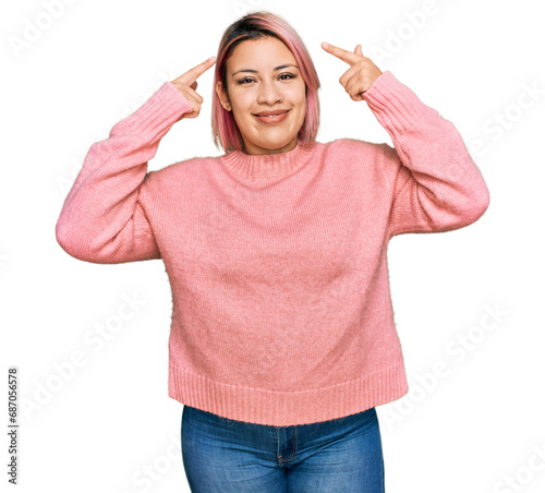 Hispanic woman with pink hair wearing casual winter sweater smiling pointing to head with both hands finger, great idea or thought, good memory