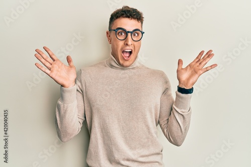 Hispanic young man wearing casual turtleneck sweater celebrating crazy and amazed for success with arms raised and open eyes screaming excited. winner concept