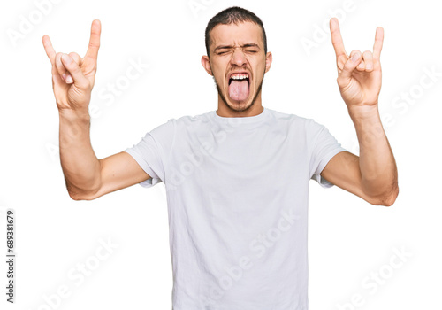 Hispanic young man wearing casual white t shirt shouting with crazy expression doing rock symbol with hands up. music star. heavy concept.