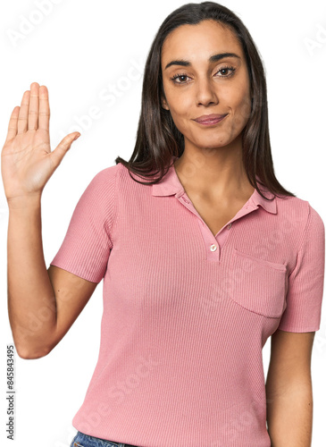 Hispanic young woman smiling cheerful showing number five with fingers.