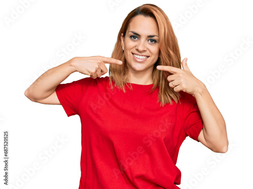 Hispanic young woman wearing casual red t shirt smiling cheerful showing and pointing with fingers teeth and mouth. dental health concept.