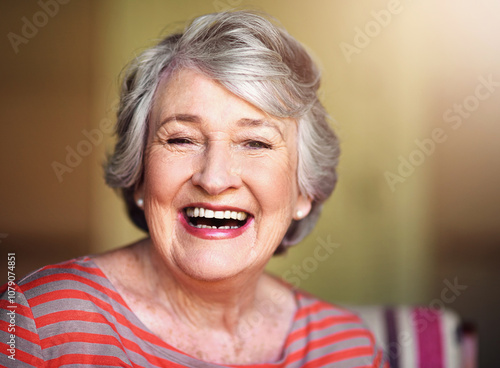 Home, senior woman and portrait with laughing for joke, funny memory or confidence in retirement. House, female person and pensioner with pride for wellness, relax or comfortable with smile in lounge