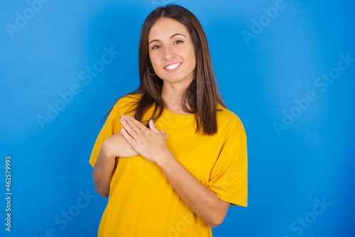 Honest Young european brunette woman wearing yellow T-shirt on blue background keeps hands on chest, touched by compliment or makes promise, looks at camera with great pleasure.