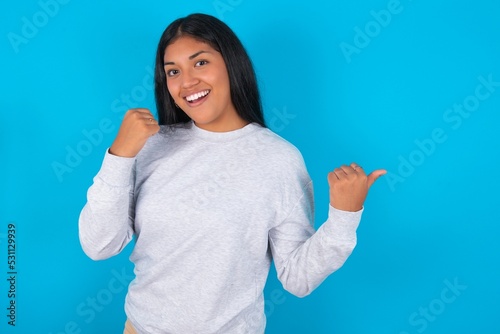 Hooray cool Young latin woman wearing gray sweater blue background point back empty space hand fist