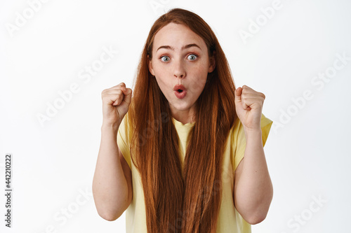 Hooray. Excited redhead girl say wow, gasp amazed, looking at screen sports game, winning, receive good news, achieve goal and rejoicing, standing against white background, fist pump