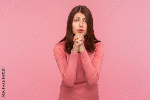 Hopeful brunette woman in pink sweater holding hands in prayer, asking for forgiveness looking at camera with regard, need help. Indoor studio shot isolated on pink background