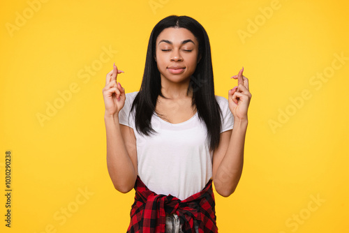 Hopeful happy young African American girl woman female student crossing fingers hoping for good luck, making wish asking dream come true isolated on yellow studio background, superstition beliefs