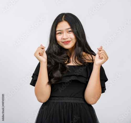 Horizontal half-body portrait shot of a beautiful smiling young girl teenager in a black dress looking at camera in the studio isolated with white background. There is copy space on the side of image