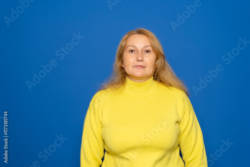 Horizontal image of a beautiful brown-haired Caucasian woman looking straight ahead at the camera wearing a yellow sweater on a blue background. Emotions concept.