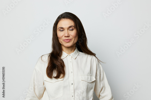 horizontal photo on a light photo of a beautiful attractive woman standing with her hair covered