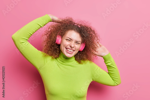 Horizontal shot of positive European woman with curly hair raises arms tilts head dressed in casual green turtleneck listens audio track via headphones isolated over pink background. Lifestyle