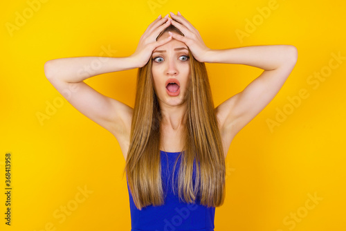 Horrible, stress, shock. Portrait of young emotional crazy woman clasping head in hands. Human emotions, facial expression concept. Trendy colors. Front view
