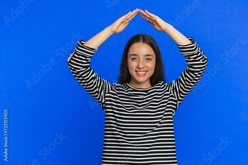 House roof about head. Young woman playing childish catching up game feeling in safe making roof above head with hands, insurance, security service. Girl isolated on blue studio background. Copy-space