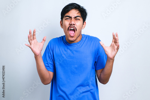 How could you? Portrait of annoyed frustrated asian man standing with raised hands, asking why.