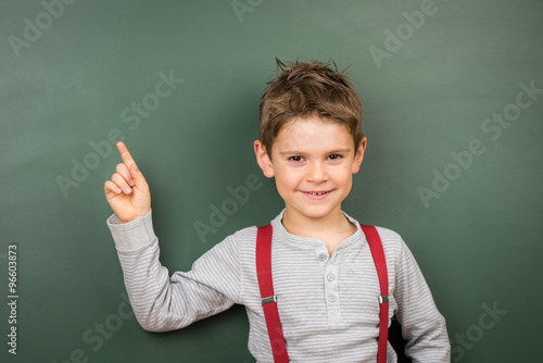 Hübscher kleiner Junge deutet auf leere Schultafel